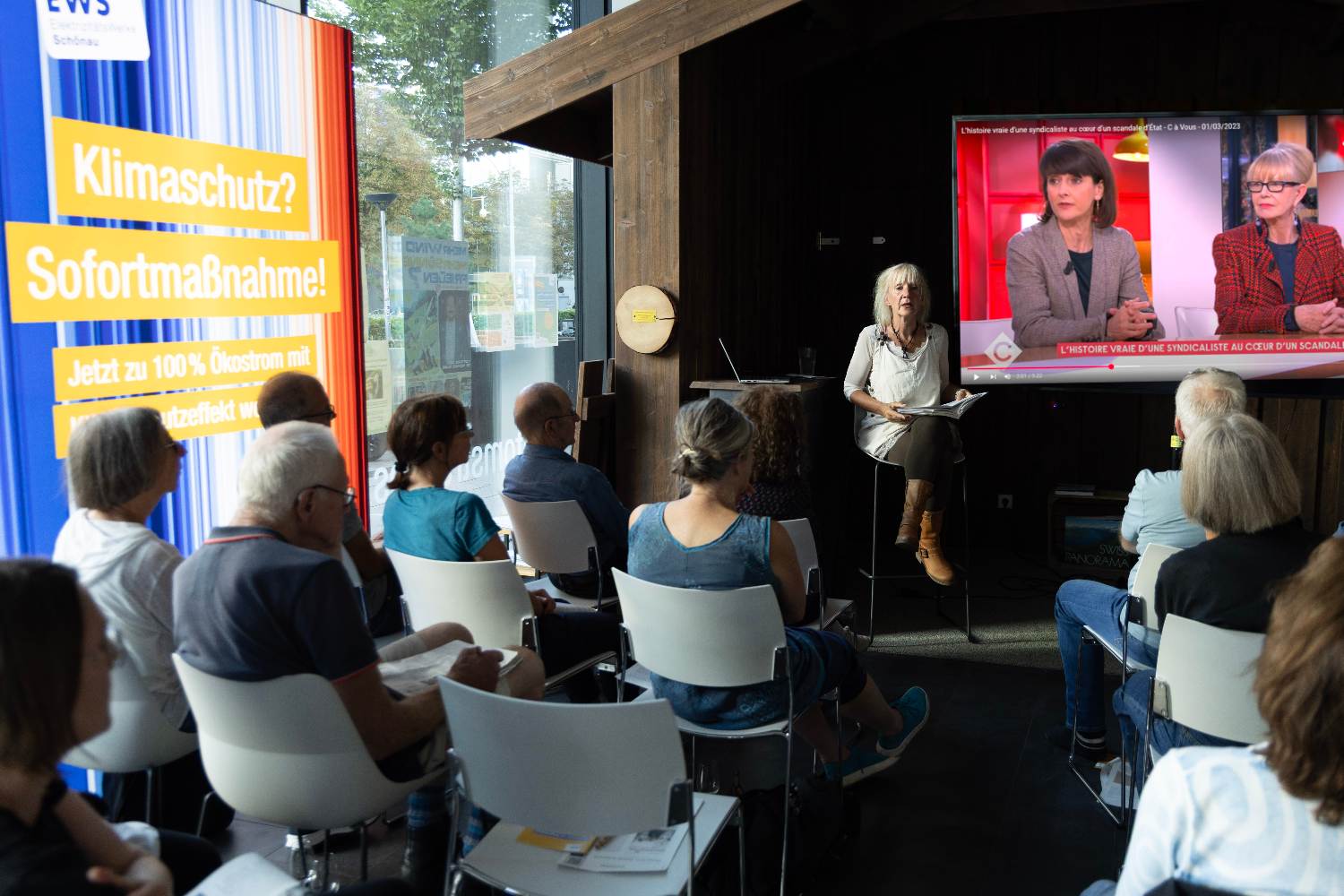 "Das Buch, aus dem Eva Stegen im EWS-Store in Freiburg vorgelesen, das sie mit Fotos zu den handelnden Personen unterlegt und die Verflechtungen untereinander erklärt hat, ist so schockierend wie unglaublich. Das Atomkartell in Frankreich, bei dem der verstaatlichte Energiekonzern EdF (Electricité de France), der frühere und zwischenzeitlich zerschlagene Reaktorbauer Areva, Politiker auf höchster Ebene bis zum früheren Präsidenten Nicolas Sarkozy sowie zahlreiche Wirtschaftsbosse und dubiose Unterhändler eine tragende Rolle spiel(t)en, hält das Publikum für zwei Stunden in Atem.